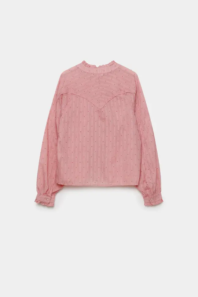 Camisa de plumeti abotonada. Mangas largas. Detalles rizados en el cuello y en los puños. Composición: 80% Poliester, 20% Algodón.