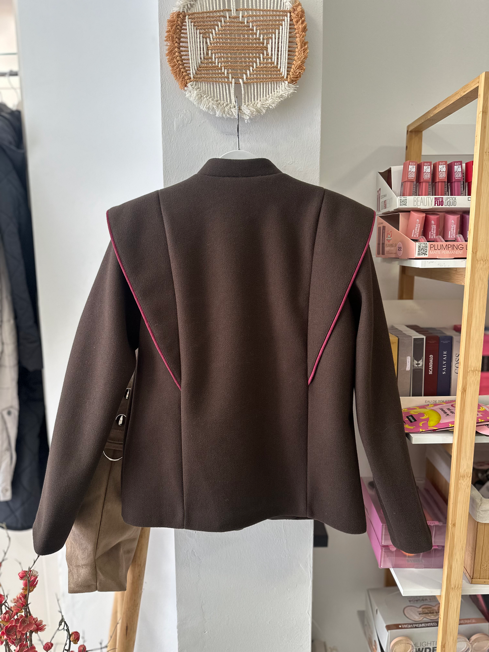 Chaqueta de paño forrada en color marrón chocolate. Contornos en color Burdeos. Delanteros. Cuello Mao. Cierre por dos botones.
