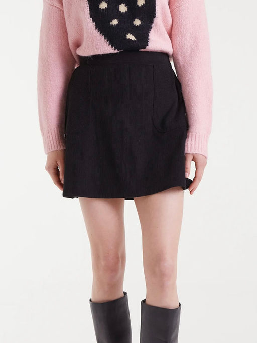 Falda corta con tejido de pana de color negro. Tiro medio con cremallera oculta lateral. Bolsillos laterales.