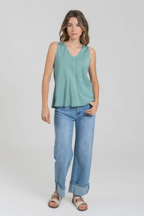 Top con escote de pico y tirantes anchos. Diseño liso. Modelo fluido. Composición 87% viscosa, 13% poliamida.