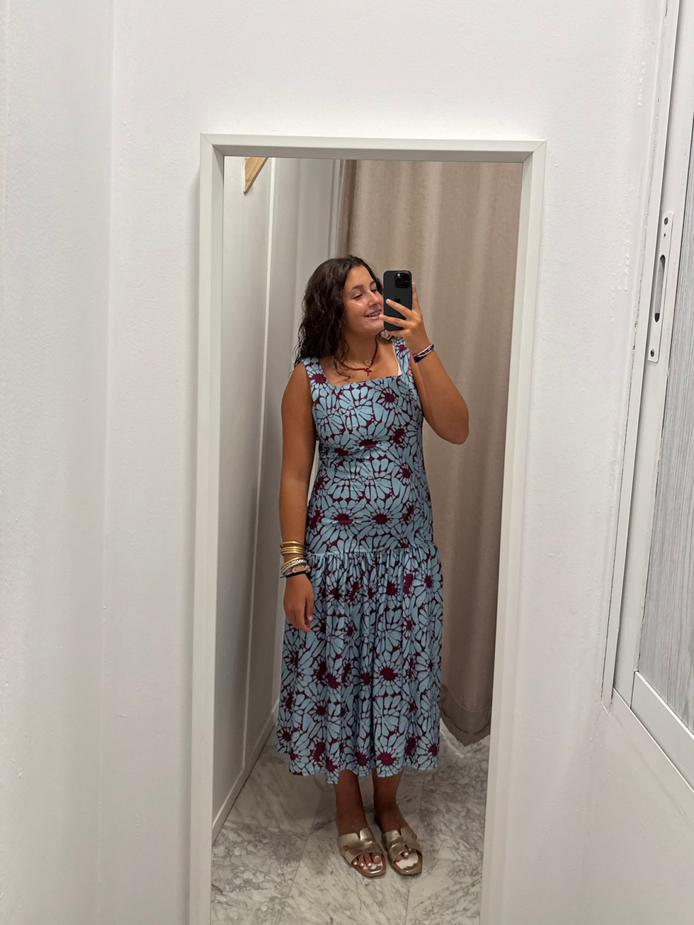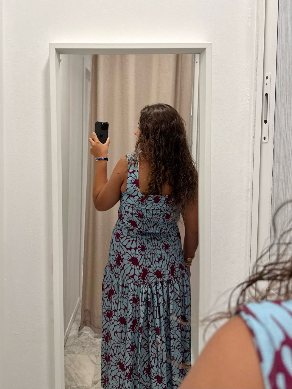 Vestido de tirantes con corte entallado hasta la cadera, en la que sale el volante que forma la falda. Longitud midi. Parte de la espalda fruncida. Escote cuadrado. Composición 100% viscosa. Talla única válida para M.